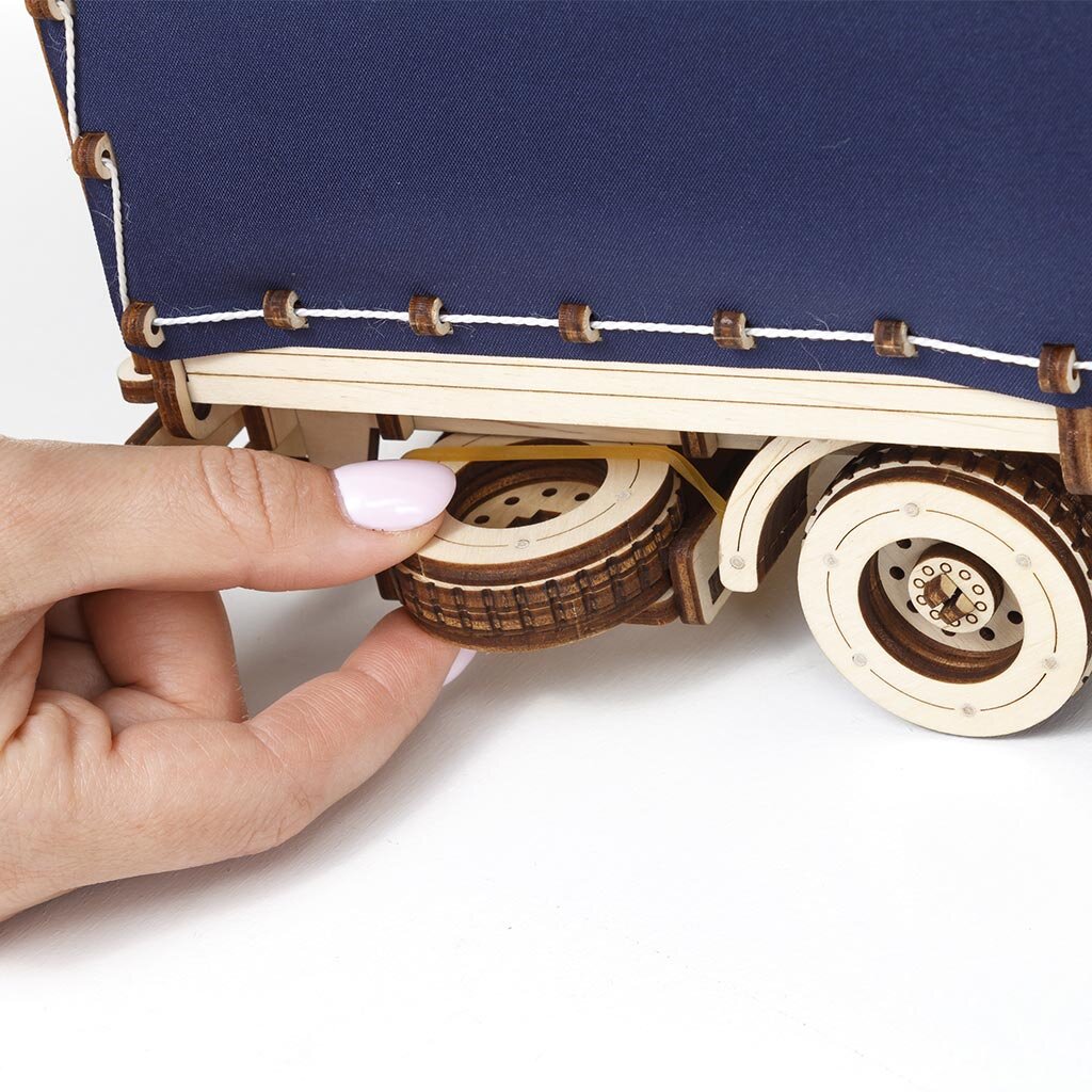 Het model is gemaakt van gecertificeerd gepolijst multiplex uit Wit-Rusland en vereist geen lijm: de onderdelen worden eenvoudig aan elkaar bevestigd met nauwkeurig gesneden verbindingen. De montage is intuïtief en wordt ondersteund door gedetailleerde instructies, waardoor het zelfs voor beginners leuk is.
